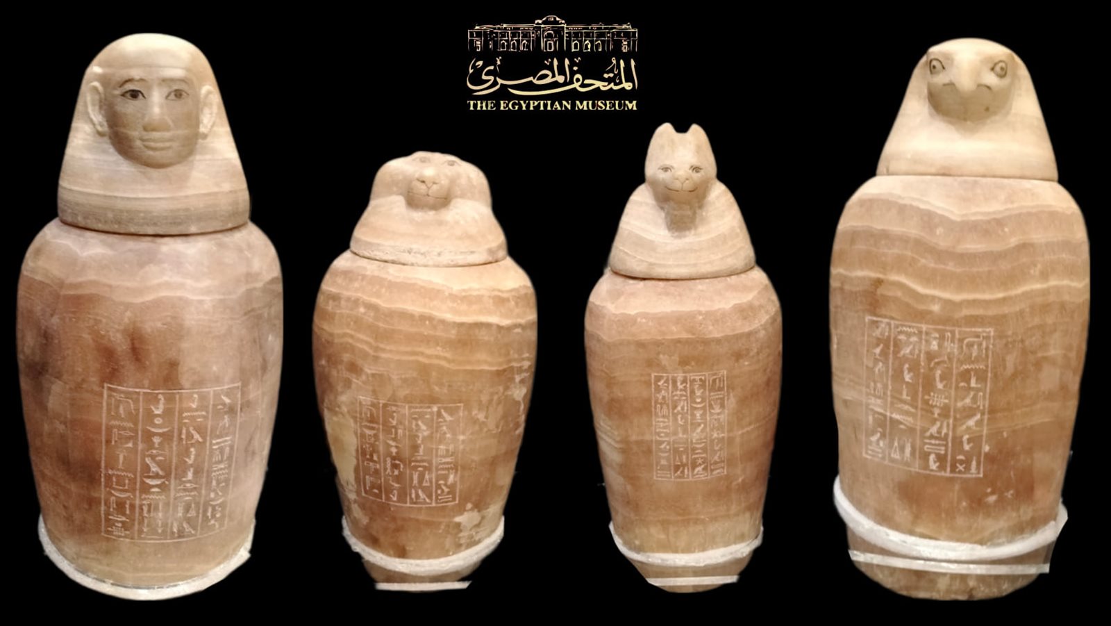 وقالت إدارة المتحف المصري بالتحرير، في بيان لها، إن الشاهد مصنوعة من الألباستر ولها أغطية مختلفة الشكل على هيئة أبناء حورس الأربعة (حابى -إمستى - دوا موت إف - قبح سنو إف)، عثر عليها بورشة التحنيط بئر K24، سقارة الأسرة 26، العصر الصاوي (664-525 ق.م).