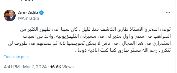 وأعلن الإعلامي عمرو أديب وفاة طارق الكاشف، إذ كتب عبر حسابه بموقع إكس تويتر سابقًا: توفي المخرج الأستاذ طارق الكاشف منذ قليل، كان سببا في ظهور الكثير من المواهب في مصر وأول مدير لي في مسيرتي التليفزيونية، واحد من أسباب استمراري في هذا المجال، في ناس لا يمكن تعويضها لأنه تم صنعهم فى ظروف لن تتكرر، رحم الله مستر طارق كما كنت أناديه دوما.