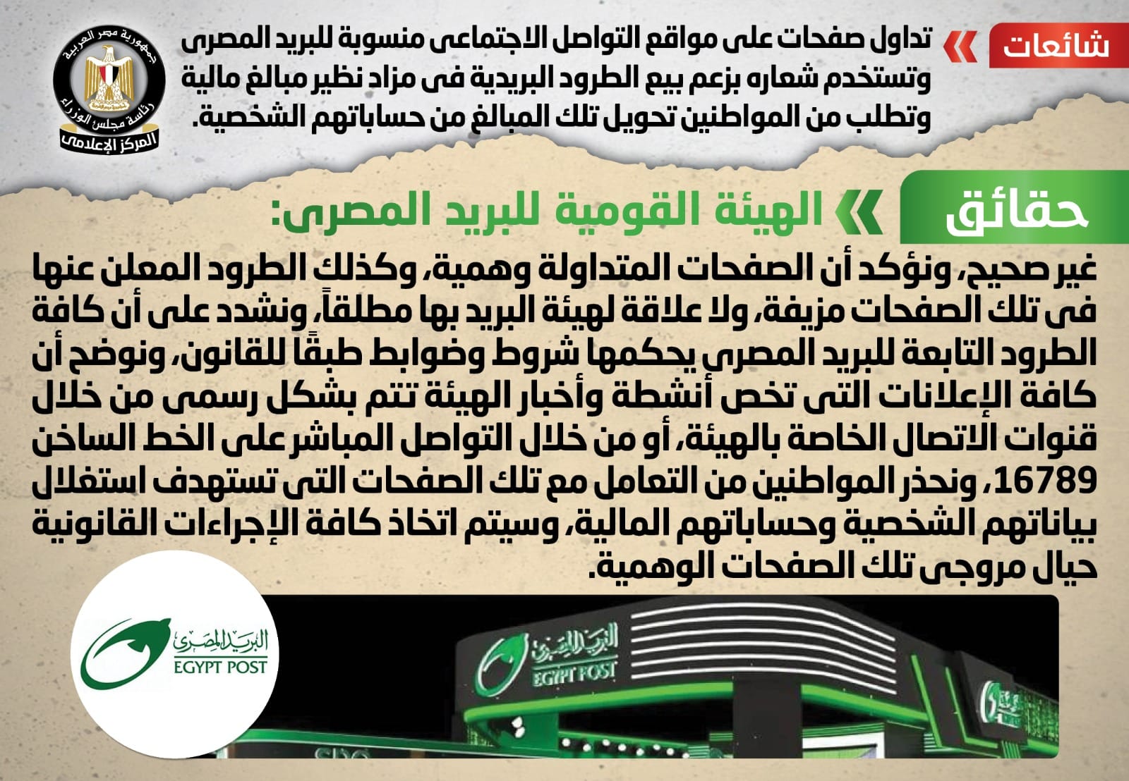 وفي هذا الصدد، تواصل المركز الإعلامي لمجلس الوزراء مع الهيئة القومية للبريد المصري، والتي نفت تلك الأنباء، مؤكدة أنه لا صحة لبيع الطرود البريدية في مزاد نظير مبالغ مالية أو طلب أي تحويلات مالية من المواطنين من حساباتهم الشخصية، وأن الصفحات المتداولة وهمية، وكذلك الطرود المعلن عنها في تلك الصفحات مزيفة، ولا علاقة لهيئة البريد بها مطلقًا، مُشددة على أن كافة الطرود التابعة للبريد المصري يحكمها شروط وضوابط طبقًا للقانون.