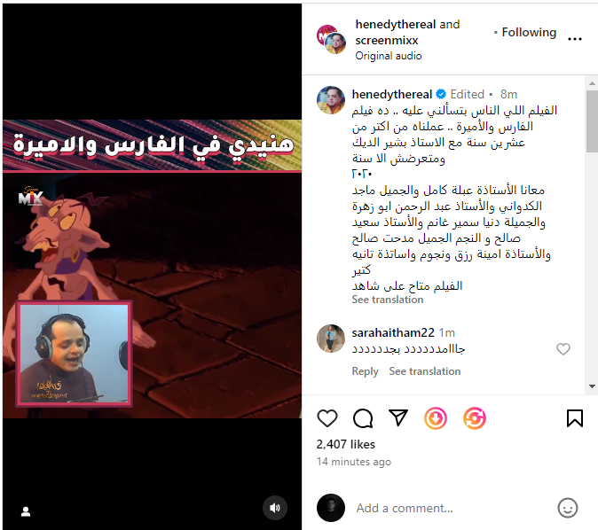 وفي سيق منفصل، تصدر الفيلم الكرتوني الفارس والأمير بطولة محمد هنيدي وعبلة كامل، محركات مواقع التواصل الاجتماعي خلال الأيام القليلة الماضية، ونشر محمد هنيدي عبر حسابه الشخصي على موقع تبادل الصور والفيديوهات انستجرام، فيديو من كواليس تسجيله دوره في العمل، وعلق عليه: فيلم الفارس والأميرة معانا فيه عبلة كامل والجميل ماجد الكدواني وعبد الرحمن أبو زهرة والجميلة دنيا سمير غانم وسعيد صالح والنجم الجميل مدحت صالح وأمينة رزق ونجوم وأساتذة تانية كتير، الفيلم متاح على شاهد.