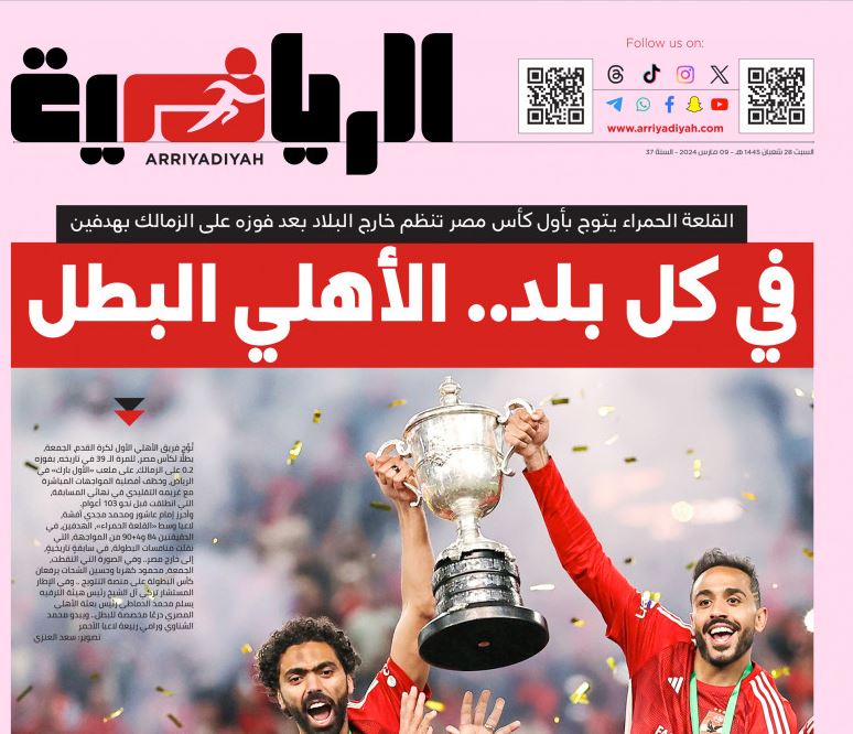 عنونت صحفية الرياضية عبر عددها الورقي: في كل بلد.. الأهلي البطل، وقالت إن لاعبو القلعة الحمراء يتوجوا بأول كأس مصر تنظم خارج البلاد، بعد فوزه على الزمالك بهدفين.