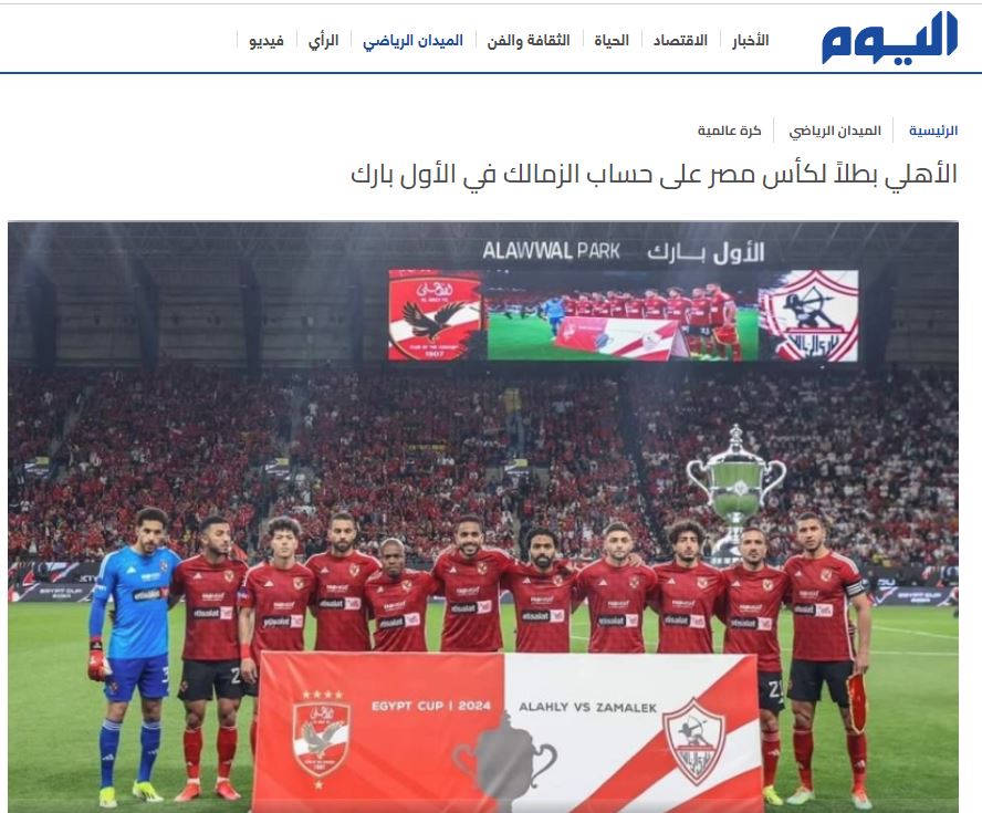أشارت اليوم السعودية إلى أن الأهلي بطلًا لكأس مصر على حساب الزمالك في الأول بارك، حيث حقق اللقب للمرة 39 في تاريخه إثر تغلبه على غريمه التقليدي الزمالك بهدفين نظيفين.