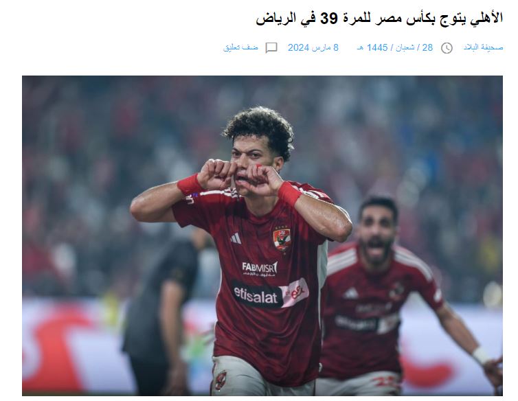 قالت صحيفة البلاد، إن الأهلي يتوج بكأس مصر للمرة 39 في الرياض، حيث أنهى لعنته أمام غريمه التقليدي، بالفوز عليه في نهائي كأس مصر للمرة الأولى منذ عام 2007، وبهذا يبتعد الأهلي بصدارة أكثر الأندية تتويجا بلقب كأس مصر 39 مرة.