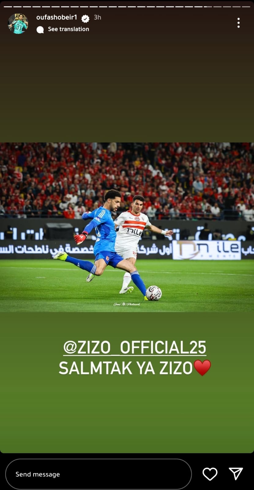 وحرص مصطفى شوبير على نشر صورة لـ زيزو عبر حسابه الرسمي على إنستجرام بعد إصابة نجم الزمالك في أنكل القدم، وعلق شوبير قائلا: سلامتك يا زيزو.