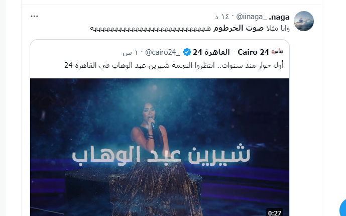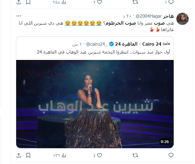 تصدرت الفنانة شيرين عبد الوهاب تريند موقع التواصل الاجتماعي إكس، تويتر سابقًا بعد دقائق من نشر الفيديو الدعائي الخاص بحوار شيرين مع موقع القاهرة 24.