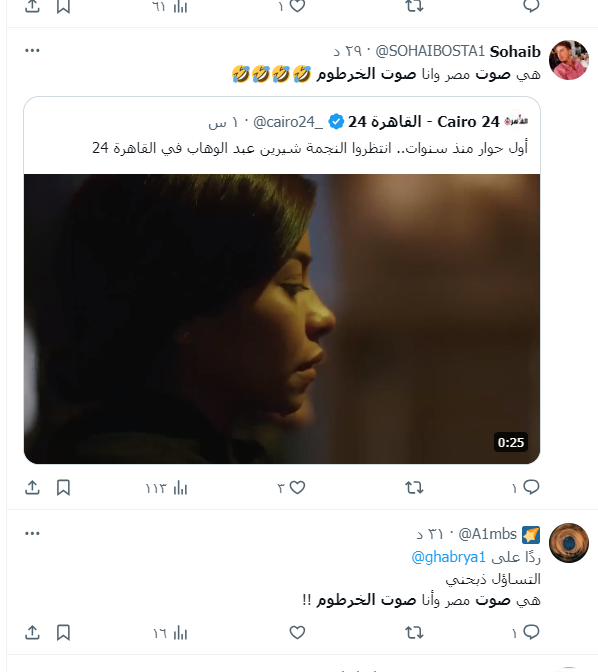 واستكملت شيرين: "يعني هي صوت مصر وأنا صوت الخرطوم، وإذا تكرر نفّس السؤال لـ الفنانة أنغام أو أي نجم هل ستكون إجابته مثلًا لا أنا صوت مصر إزاي طب وشيرين؟!!!، لذلك أنا تحدثت عن نفسي ولم أخطئ في شيء، ولا أعرف ما سبب زعل أنغام من تصريحاتي وتعاملها معي بشكل سيئ، على الرغم من أنني وجّهت الشكر لها بعد حفلتها وقلت إنها تستحق أن تكون ليس فقط صوت مصر إنما صوت أي دولة تغني فيها".