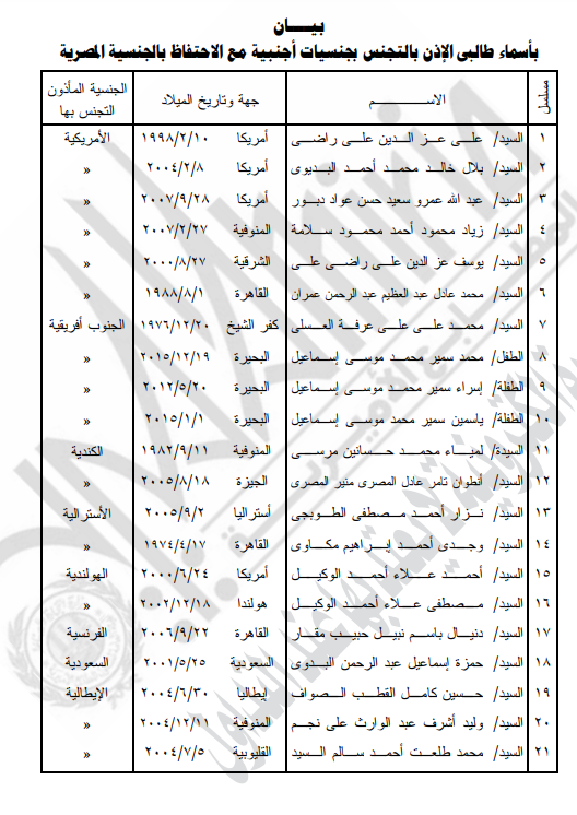 وفي القرار رقم 317 لسنة 2024 قررت وزارة الداخلية يؤذن لكل من الواحد والعشرين مواطنا أولهم عبد الله وليد محمد مسعد وآخرهم إبراهيم أحمد إبراهيم إبراهيم المدرجة أسماؤهم بالبيان المرفق بالتجنس بالجنسية الأجنبية الموضحة قرين اسم كل منهم مع احتفاظهم بالجنسية المصرية.