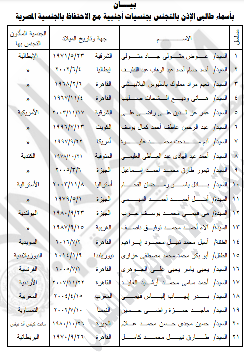 وفي القرار رقم 316 لسنة 2024 قررت وزارة الداخلية يؤذن لكل من الواحد والعشرين مواطنا أولهم عوض متولى جاد متولي وآخرهم طارق نبيل محمد كامل المدرجة أسماؤهم بالبيان المرفق بالتجنس بالجنسية الأجنبية الموضحة قرين اسم كل منهم مع احتفاظهم بالجنسية المصرية.