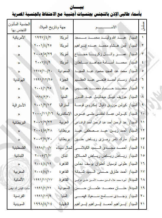 وفي القرار رقم 322 قررت وزارة الداخلية يؤذن لكل من الواحد والعشرين مواطنا أولهم محمد جمال سالم حسن وآخرهم خالد كرم عبد النبى البنا المدرجة أسماؤهم بالبيان المرفق بالتجنس بالجنسية الأجنبية الموضحة قرين اسم كل منهم مع احتفاظهم بالجنسية المصرية.