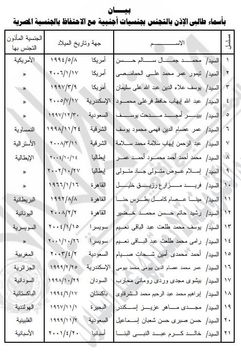 ونصت المادة الأولي يؤذن لكل من الواحد والعشرين مواطنا أولهم على عز الدين على راضي وآخرهم محمد طلعت أحمد سالم السيد المدرجة أسماؤهم بالبيان المرفق بالتجنس بالجنسية الأجنبية الموضحة قرين اسم كل منهم مع احتفاظهم بالجنسية المصرية.