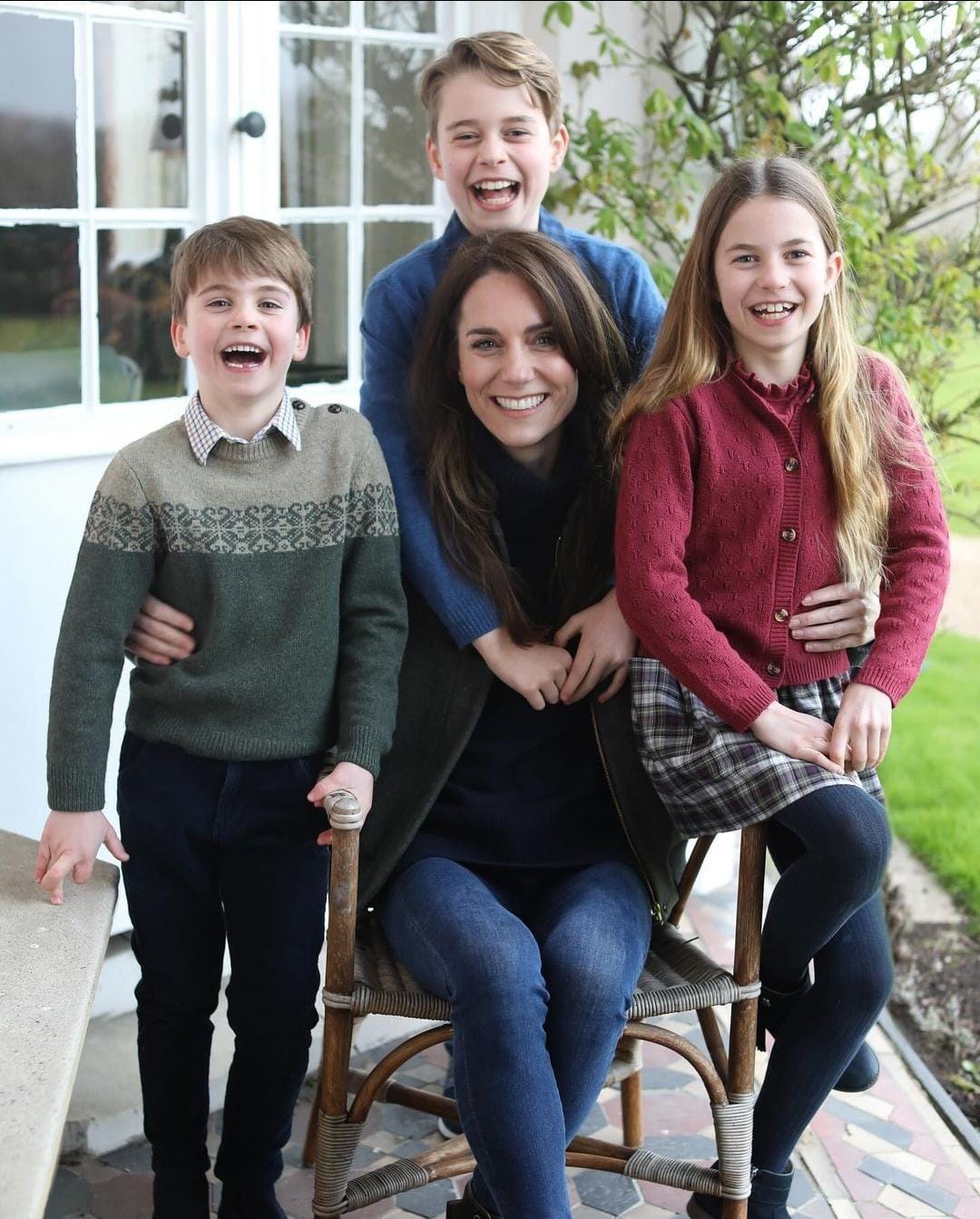وظهرت كيت في الصورة وهي تجلس مبتسمة، وذراعيها ملفوفة حول طفليها الأصغر سنا الأمير لويس والأميرة شارلوت، بينما يقف الطفل الأكبر الأمير جورج خلف والدته ويعانقها، وفي رسالة مرفقة بالصورة على إنستجرام، كتبت كيت: شكرًا لكم على تمنياتكم الطيبة ودعمكم المستمر خلال الشهرين الماضيين، أتمنى للجميع عيد أم سعيدًا.