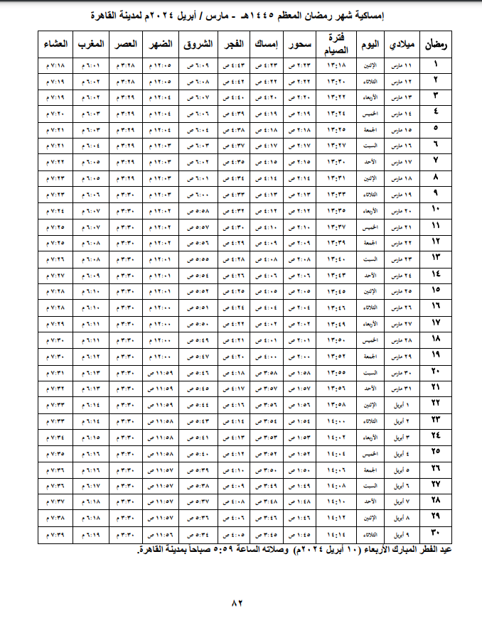 وفيما يلي يقدم لكم القاهرة 24 إمساكية شهر رمضان، ومواقيت الصلاة في مصر بداية من 1 رمضان الموافق 11 مارس 2024، وحتى نهاية الشهر الفضيل يوم 30 رمضان الموافق 9 أبريل والذي يشهد أطول فترة صيام خلال شهر رمضان 2024.
