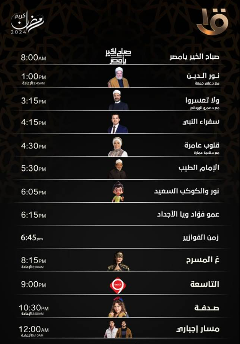 ويعرض برنامج قلوب عامرة مع الدكتورة نادية عمارة الساعة 4:30 مساءً ويليه برنامج الإمام الطيب الساعة 5:30 مساءً.