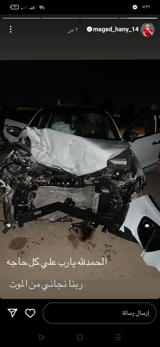 ونشر اللاعب عبر صفحته علي انستجرام صور الحادث وكتب عليها " الحمد لله يارب علي كل حاجة.. ربنا نجاني من الموت ".