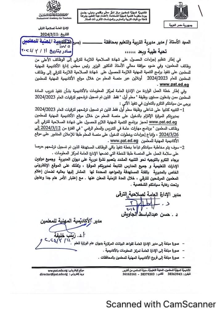 -التنبيه كتابيا على شاغلى وظيفة معلم أول فقط الذين تم تسجيل ترشحهم لترقيات العام2024/2023 بمديريتكم الإلتزام بالدخول على منصة المعلم من خلال موقع الأكاديمية المهنية للمعلمينwww.pat.ed.eg لحجز برنامج التنمية المهنية اللازم للحصول على شهادة الصلاحية للترقي إلى وظائف المعلمين برنامج مهارات عامة في التدريس والمعلم الرقمي في الفترة من2024/3/12 إلى 2024/3/26، وإتباع إجراءات وخطوات الدخول على منصة المعلم طبقا للإعلان المنشور على موقع الأكاديمية المهنية للمعلمين www.pat.ed.eg.