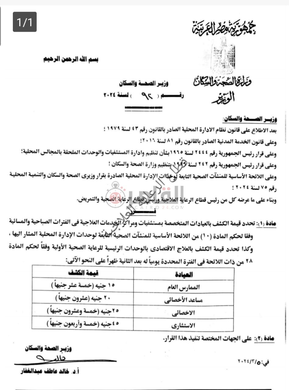 وفقا لقرار وزير الصحة والسكان، حصل القاهرة 24، على نص تحديد قيمة الكشف بالعيادات المتخصصة بمستشفيات ومراكز الخدمات العلاجية في الفترات الصباحية والمسائية وفقا لحكم المادة 10 من اللائحة الأساسية للمنشآت الصحية التابعة لوحدات الإدارة المحلية المشار إليها، وكذا تحدد قيمة الكشف بالعلاج الاقتصادي بالوحدات الرئيسية للرعاية الصحية الأولية وفقًا لحكم المادة 28 من ذات اللائحة في الفترة المحددة يوميًا له بعد الثانية ظهرًا.