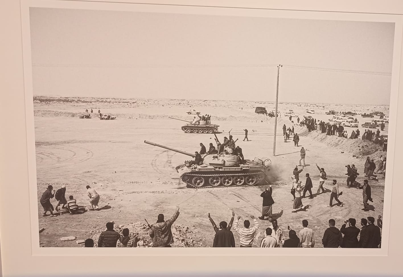 كما يظهر في صورة أخرى رجال ليبيون يهمون بالاستيلاء على أسلحة وآليات ثقيلة، بهدف القتال ضد أنصار القذافي خارج أجدابيا شرق ليبيا في 2 مارس 2011، وذلك بعد أن كانوا مجرد مدنيين قبل أيام فقط.