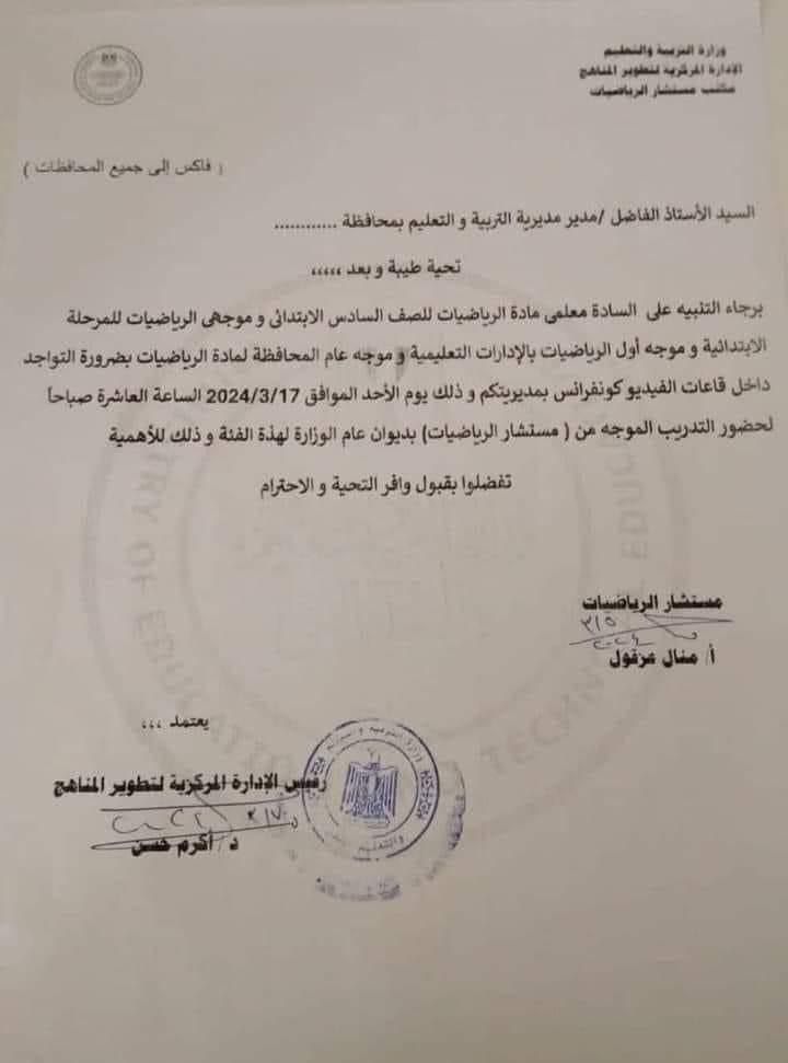 وجهت وزارة التربية والتعليم والتعليم الفني، خطابا إلى المديريات التعليمية، مشددة على أعضاء هيئة التدريس من معلمي مادة الرياضيات للصف السادس الابتدائي وموجهي الرياضيات للمرحلة الابتدائية وموجه أول الرياضيات بالإدارات التعليمية وموجه عام المحافظة لمادة الرياضيات بضرورة التواجد داخل قاعات الفيديو كونفرانس بالمديريات يوم الأحد الموافق 17 مارس الجاري في العاشرة صباحًا؛ لحضور التدريب الموجه من مستشار الرياضيات بديوان عام الوزارة لهذه الفئة وذلك للأهمية.