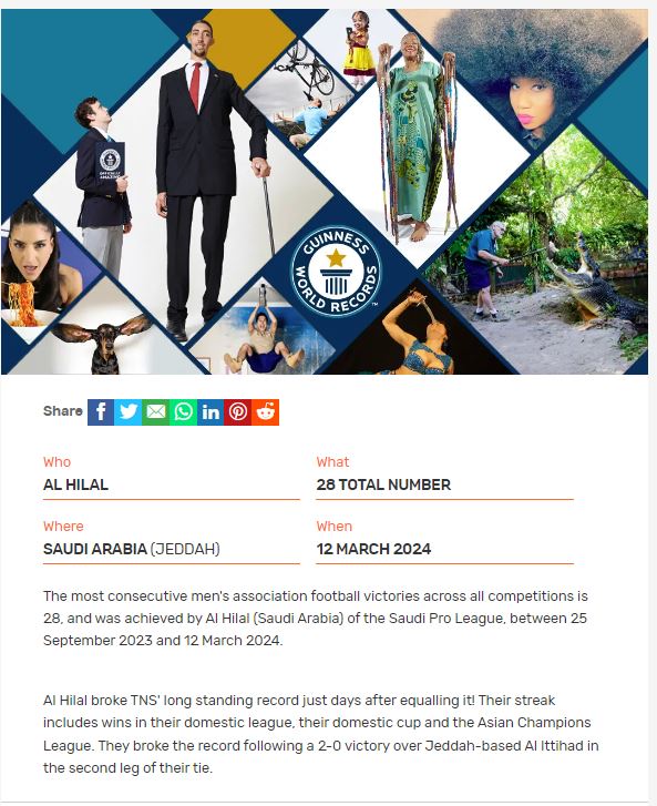 وحقق فريق الهلال السعودي سلسلة انتصاراته التي أدخلته موسوعة جينيس خلال الفترة ما بين 25 سبتمبر 2023 وحتى 12 مارس 2024.
