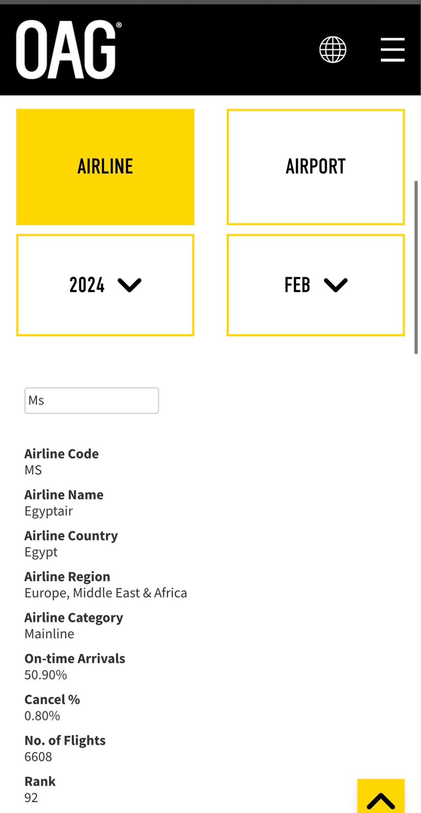 وأفاد تقرير مؤسسة OAG العالمية المتخصصة في مجال السفر والطيران، بأن شركة مصر للطيران نفذت في شهر فبراير الماضي 6608 رحلات بنسبة انتظام مواعيد الرحلات 50.9%، وهو الأقل في تاريخ مصر للطيران.