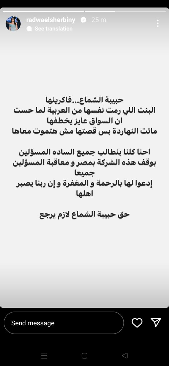 وكتبت رضوى الشربيني ستوري عبر حسابها الشخصي بـ موقع تبادل الصور والفيديوهات القصيرة انستجرام، قالت فيها: حبيبة الشماع فاكرينها، البنت اللي رمت نفسها من العربية لما حست أن السواق عايز يخطفها.. ماتت النهاردة بس قصتها مش هتموت معاها.