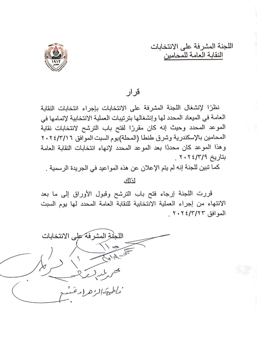 وجاء نص القرار كالآتي: نظرًا لانشغال اللجنة المشرفة على الانتخابات بإجراء انتخابات النقابة العامة في الميعاد المحدد لها، وانشغالها بترتيبات العملية الانتخابية لإتمامها في الموعد المحدد.