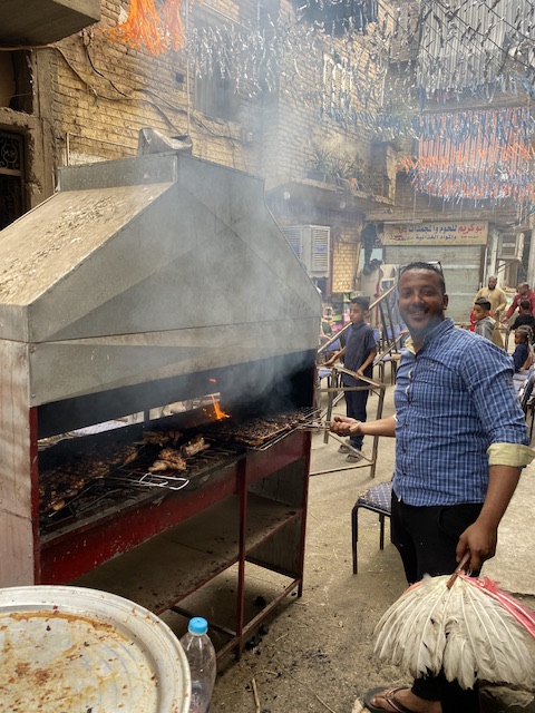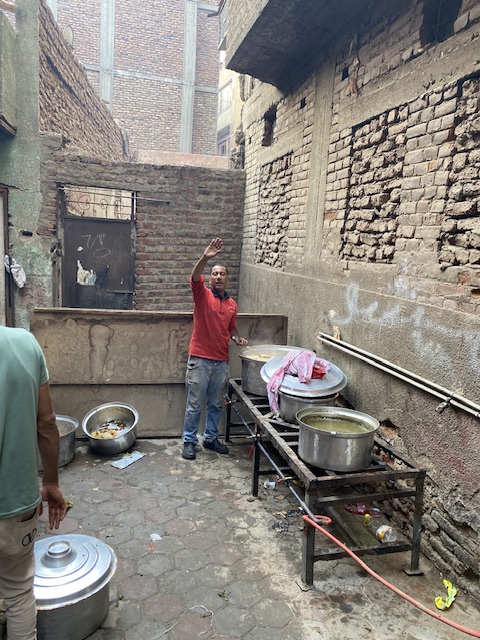 فيما قال الشيف المسؤول عن إعداد المائدة والوجبات: عاملين مشاوي فراخ ورز وملوخية وسلطات وعصائر، ومكملين الحمد لله، رمضان شهر الخير.