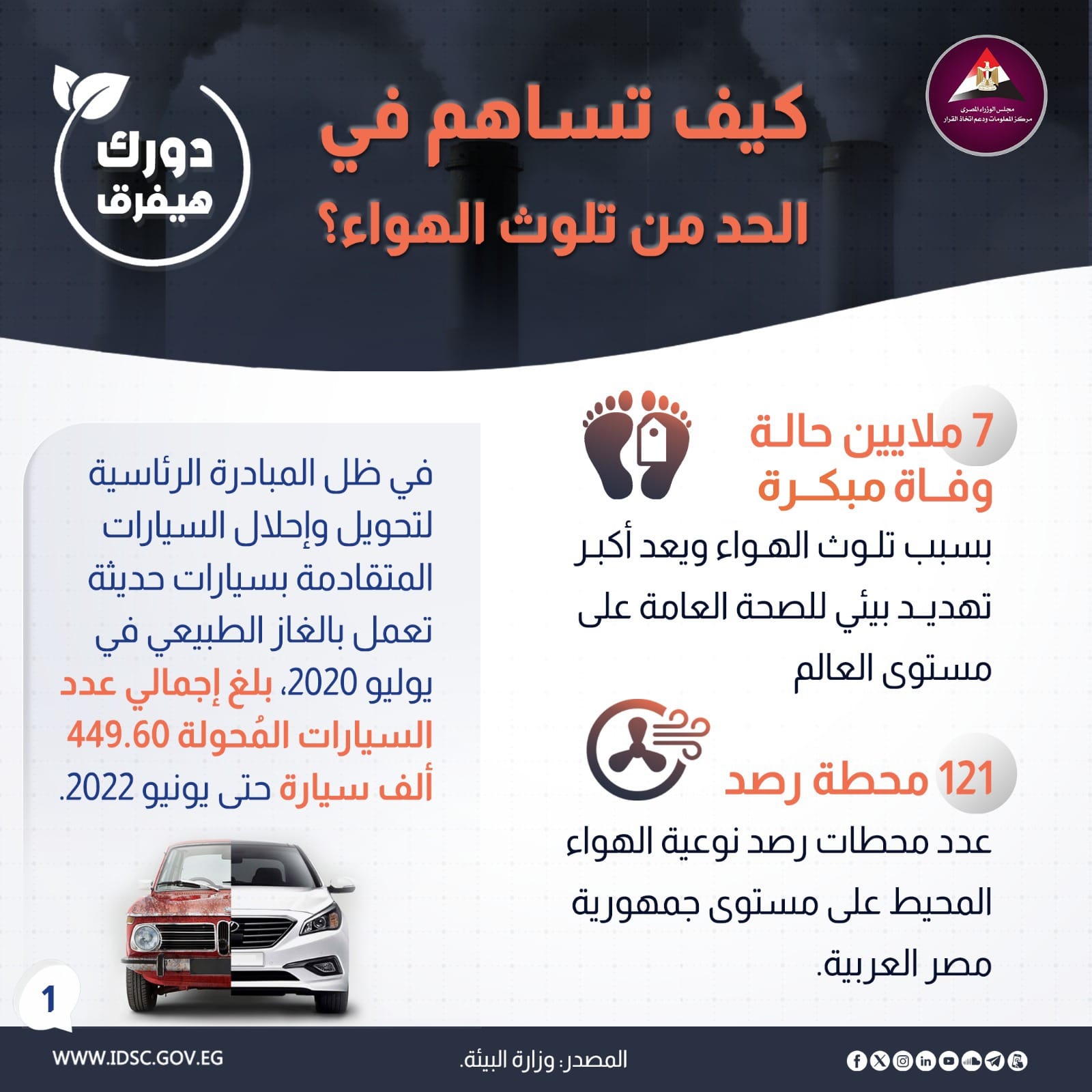 وأفاد معلومات الوزراء، خلال انفوجراف، عبر صفحته الرسمية على فيس بوك، أن 121 محطة رصد عدد محطات رصد نوعية الهواء المحيط على مستوى جمهورية مصر العربية، مضيفا أنه في ظل المبادرة الرئاسية لتحويل وإحلال السيارات المتقادمة بسيارات حديثة تعمل بالغاز الطبيعي في يوليو 2020، بلغ إجمالي عدد السيارات المحولة 449.60 ألف سيارة حتى يونيو 2022.