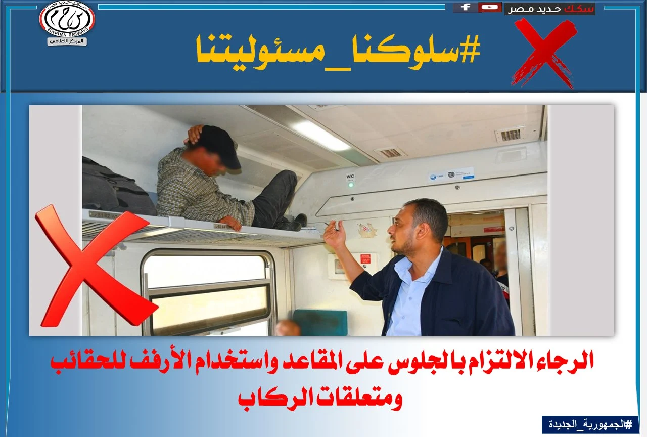 جددت الهيئة القومية لـ سكك حديد مصر، تحذيرها لركاب القطارات على جميع الخطوط، من تكرار ظاهرة الجلوس على أرفف الحقائب ومتعلقات الركاب داخل عربات القطارات، وذلك من أجل الحفاظ على سلامة الركاب وعدم تعريض حياتهم للخطر، كذا على عدم جواز الجلوس فى عربة محجوزة، يأتي ذلك استكمالًا للحملة التوعوية التي تطبقها وزارة النقل داخل هيئة السكك الحديدية.