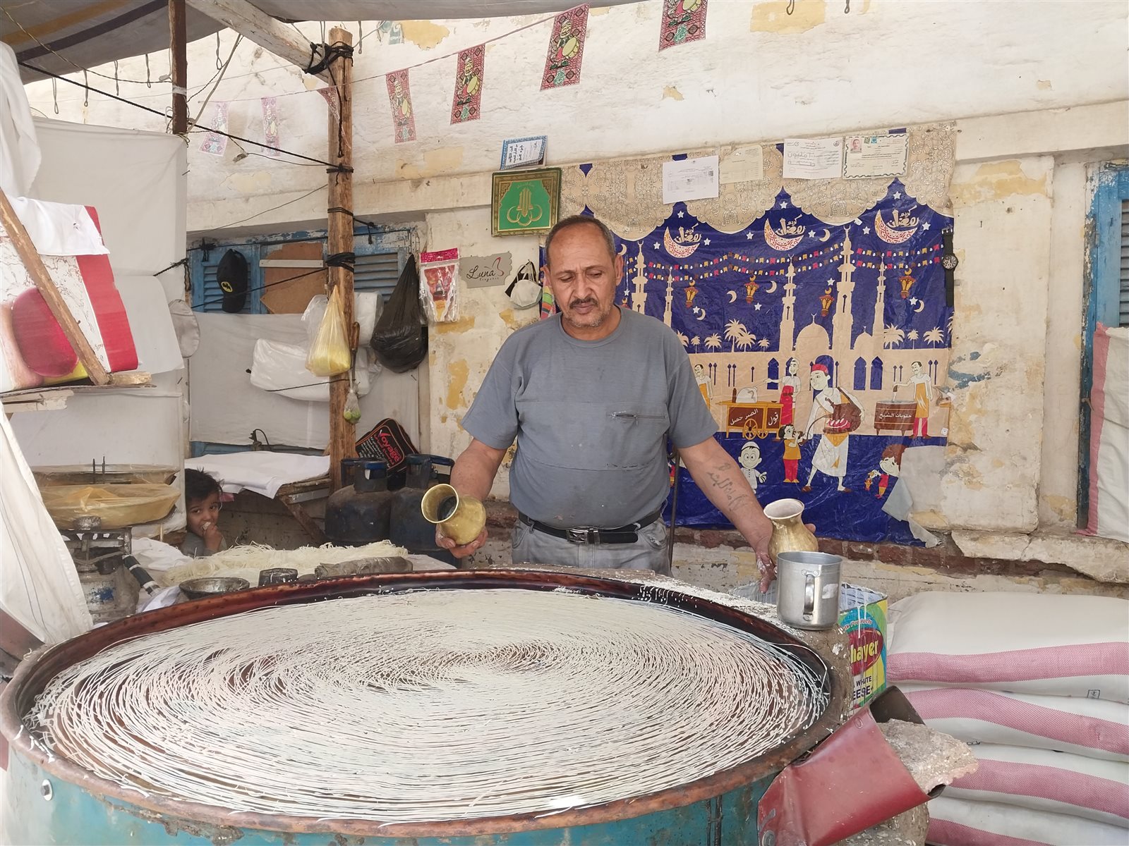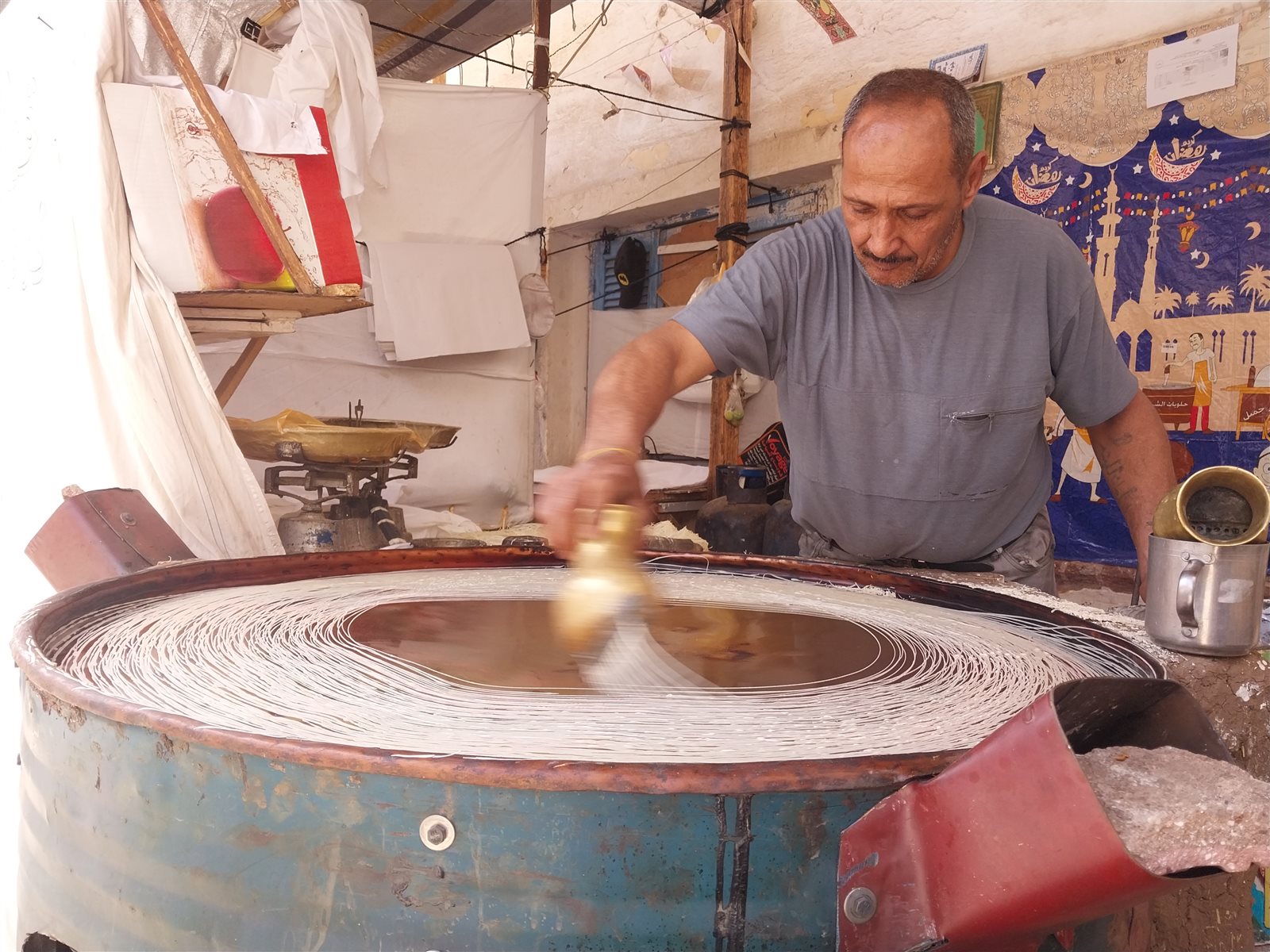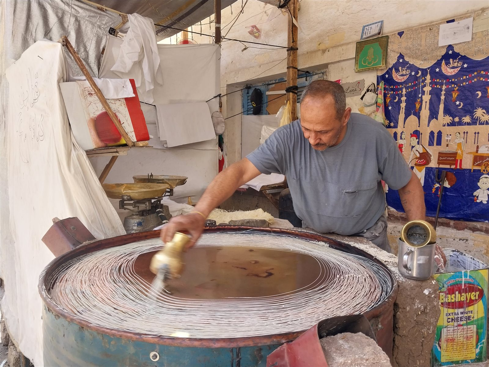 وأشار عم أحمد إلى أنه يعمل في رش الكنافة البلدي بأدوات يرجع تاريخها لأكثر من 250 عامًا، لا يوجد لها مثيل الآن وهي عبارة عن طاسة من النحاس الزجاجي، 2 كوز من النحاس الخالص، مشيرًا إلى أن هذه الأدوات ورثها عن أجداده.
