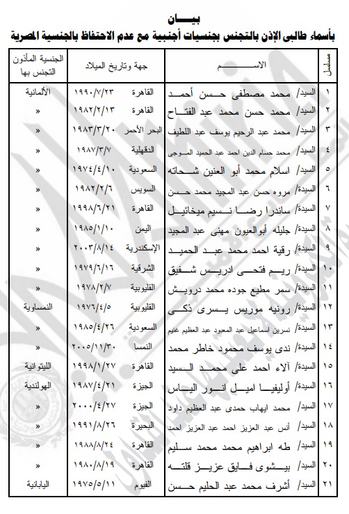 نشرت الجريدة الرسمية قرار وزارة الداخلية، بالسماح لـ 21 شخصًا بالحصول على جنسيات الدول الأجنبية، مع عدم احتفاظهم بـ الجنسية المصرية.