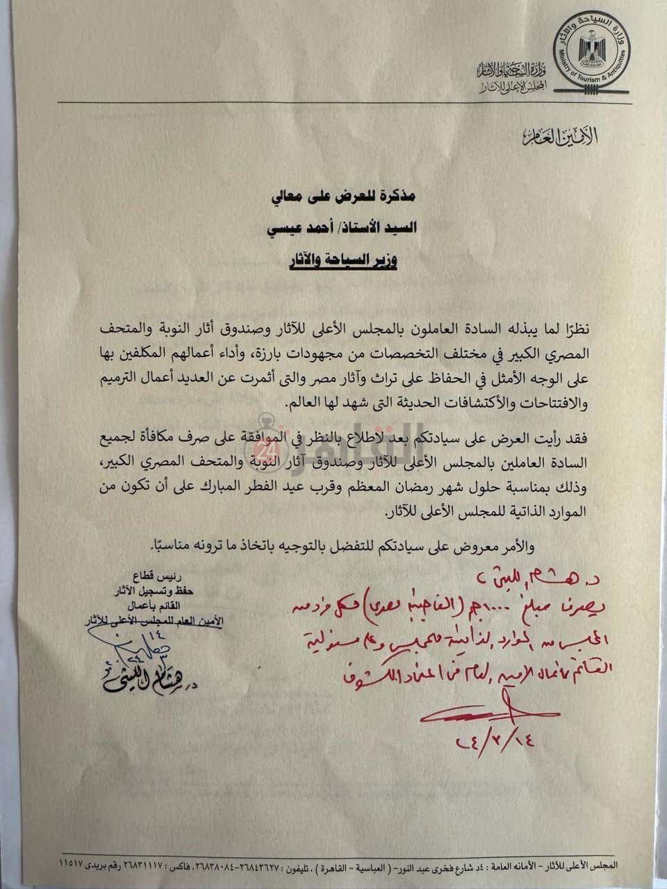 وتابع: فقد رأيت العرض على سيادتكم بعد الاطلاع بالنظر في الموافقة على صرف مكافأة لجميع العاملين بـ المجلس الأعلى للآثار وصندوق آثار النوبة والمتحف المصري الكبير أيضًا، وذلك بمناسبة حلول شهر رمضان المعظم وقرب عيد الفطر المبارك على أن تكون من الموارد الذاتية للمجلس الأعلى للآثار، وبذلك يصرف 1000 جنيه مكافأة لجميع العاملين بالمجلس الأعلى للآثار.