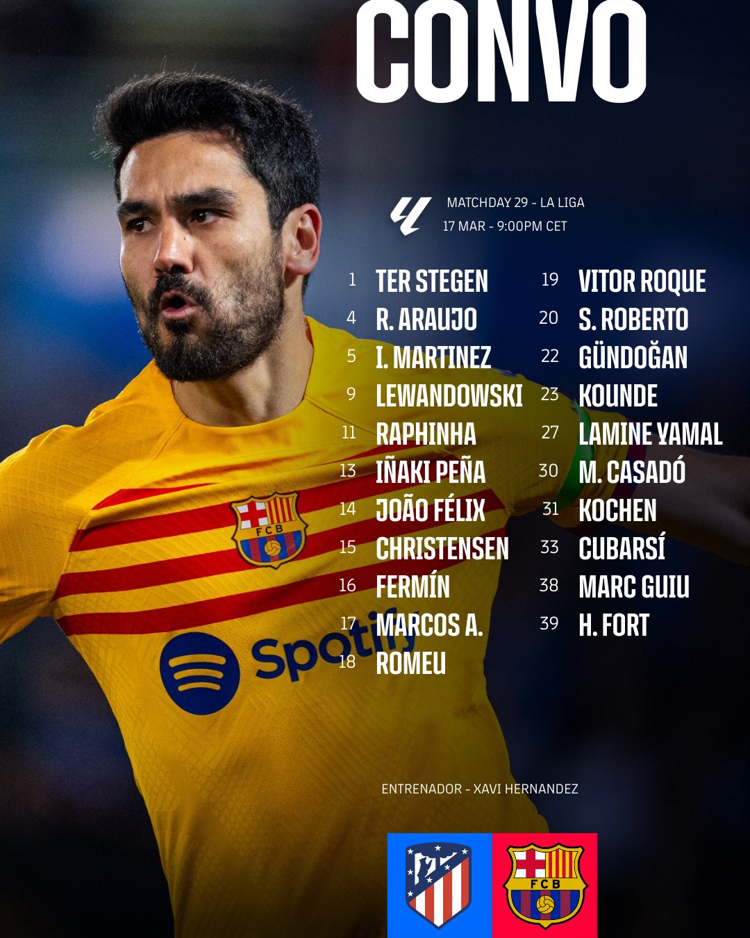 أعلن تشافي هيرنانديز المدير الفني لفريق برشلونة، قائمة اللاعبين المشاركة في مباراة أتلتيكو مدريد المقرر لها اليوم الأحد، في قمة منافسات الدوري الإسباني.