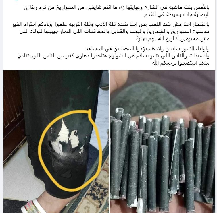 قالت: بالأمس بنت ماشية في الشارع وعبايتها زي ما أنتم شايفين من الصواريخ من كرم ربنا إن الإصابة جات بسيطة في القدم باختصار أحنا مش ضد اللعب بس احنا ضد قلة الأدب وقلة التربية علموا أولادكم احترام الغير، وأولياء الأمور سايبين ولادهم يؤذوا المصلين في المساجد والسيدات والناس اللي بتمر بسلام في الشوارع هتاخدوا دعاوي كثير من الناس اللي بتتأذي.