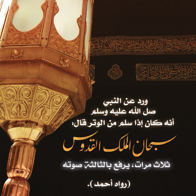 - في صحيح النسائي: "كانَ رسولُ اللَّهِ يقرأُ في الوترِ ب سبِّحِ اسمَ ربِّكَ الأعلى وفي الرَّكعةِ الثَّانيةِ ب قل يا أيُّها الكافرونَ وفي الثَّالثةِ ب قل هوَ اللَّهُ أحدٌ ولا يسلِّمُ إلَّا في آخرِهنَّ ويقولُ يعني بعدَ التَّسليمِ سبحانَ الملِك القدُّوسِ ثلاثًا" رواه أبي بن كعب والمحدث الألباني.