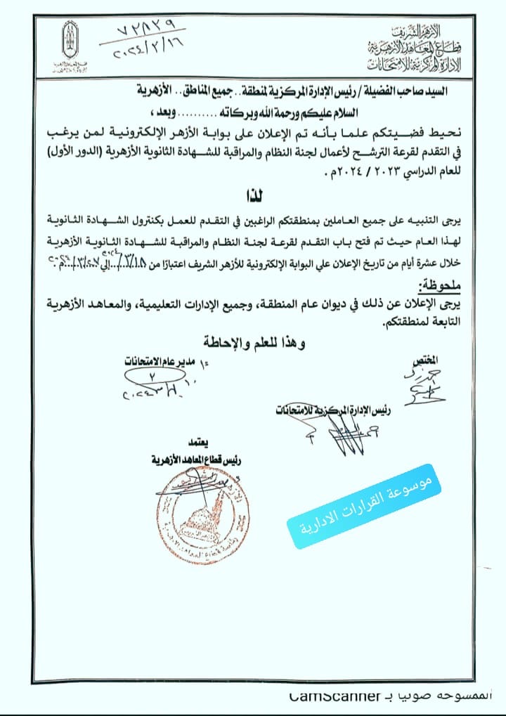 فتح باب التقديم للعمل بكنترول الشهادة الثانوية الأزهرية للعام الدراسي 2024