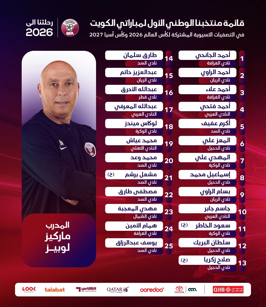 أعلن ماركيز لوبيز المدير الفني لـ منتخب قطر، قائمة العنابي استعدادًا لمواجهتي الكويت في تصفيات كأس آسيا 2027 وكأس العالم 2026.