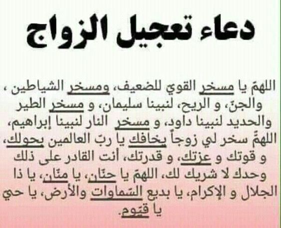 - يا من قلت للشيء كن فيكون، اللهم يا مسخّر القويّ للضّعيف ومسخر الجن والرّيح لنبيّنا سليمان، ومسخّر الطّير والحديد لنبيّنا داود، ومسخّر النّار لنبيّنا إبراهيم، اللهمّ سخّر لي زوجًا يخافك يا ربّ العالمين بحولك وقوّتك وعزّتك وقدرتك، أنت القادر على ذلك وحدك لا شريك لك، اللهمّ يا حنّان يا منّان يا ذا الجلال والإكرام يا بديع السماوات والأرض يا حيّ يا قيّوم.
