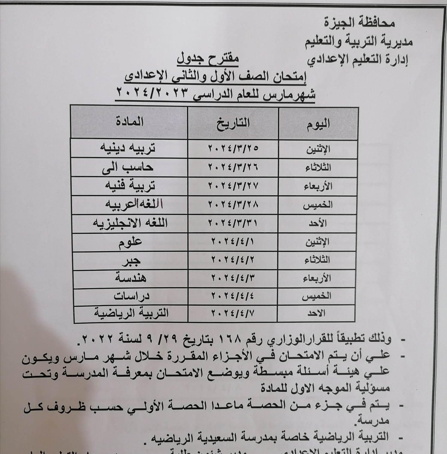 جدول امتحانات شهر مارس 2024 لطلاب أولى وثانية إعدادي الجيزة