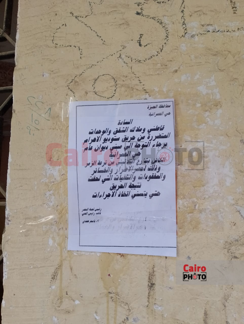 طالب حي العمرانية في محافظة الجيزة، قاطني وملاك الشقق والوحدات المتضررة من حريق ستوديو الأهرام بالتوجه إلى مبنى ديوان عام الحي؛ لحصر الخسائر والمفقودات من الحادث لاتخاذ الإجراءات اللازمة.