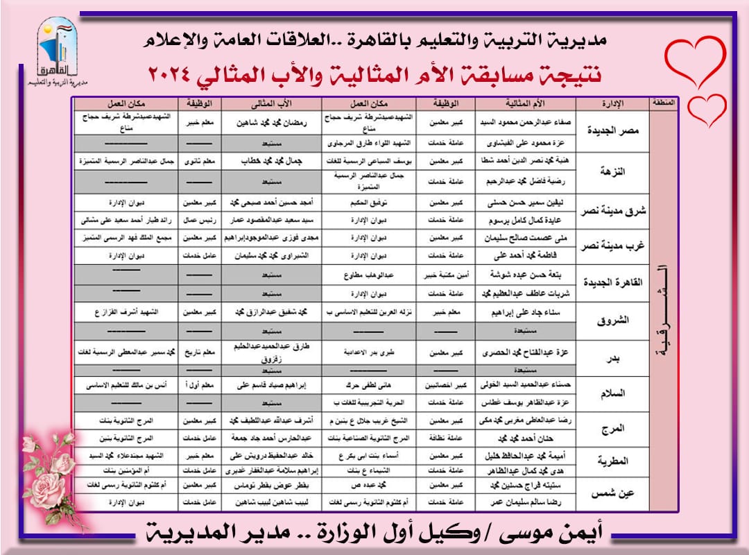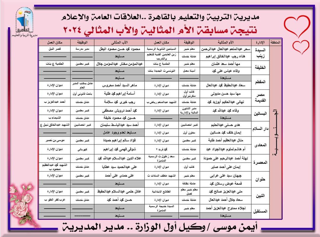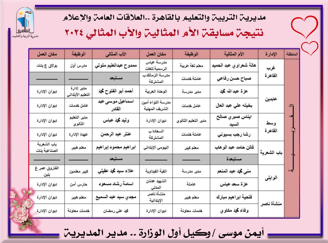 إعلان نتيجة مسابقة الأم والأب المثاليين على مستوى مديرية تعليم القاهرة| أسماء