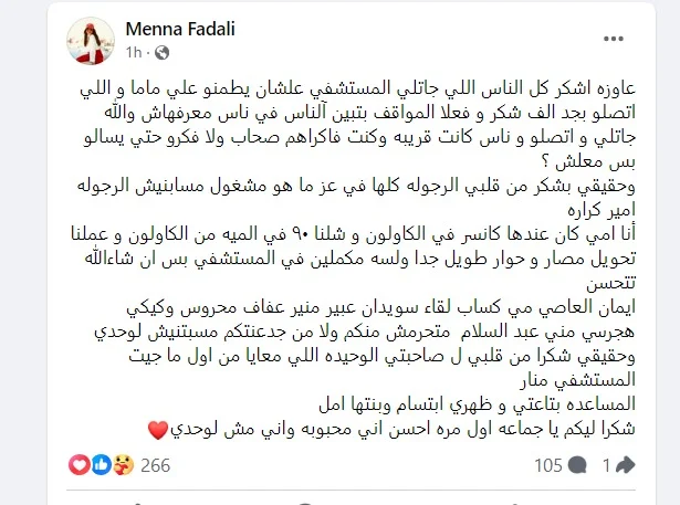 وكتبت منة فضالي، منشورا عبر حسابها الشخصي بموقع فيسبوك، وجهت من خلاله رسالة شكر لكل من تواصل معها ومساندتها في أزمتها، قائلة: عاوزة أشكر كل الناس اللي جاتلي المستشفى علشان يطمنوا على ماما، واللي اتصلو، بجد ألف شكر وفعلًا المواقف بتبين الناس.