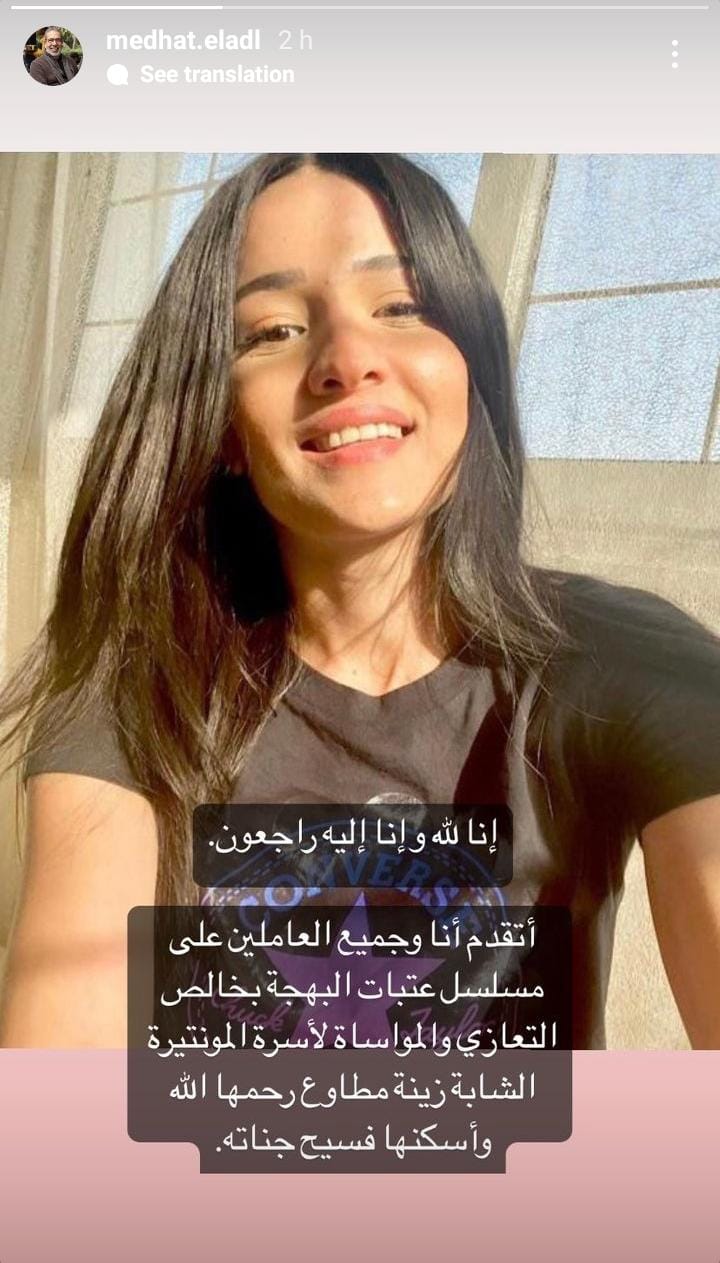 وسبق وأعلن السيناريست مدحت العدل وفاة زينة مطاوع، من خلال ستوري نشرها عبر حسابه الرسمي بموقع انستجرام، حيث كتب: إنا لله وإنا إليه راجعون، أتقدم أنا وجميع العاملين على مسلسل عتبات البهجة بخالص التعازي والمواساة لأسرة المونتيرة الشابة زينة مطاوع، رحمها الله وأسكنها فسيح جناته.