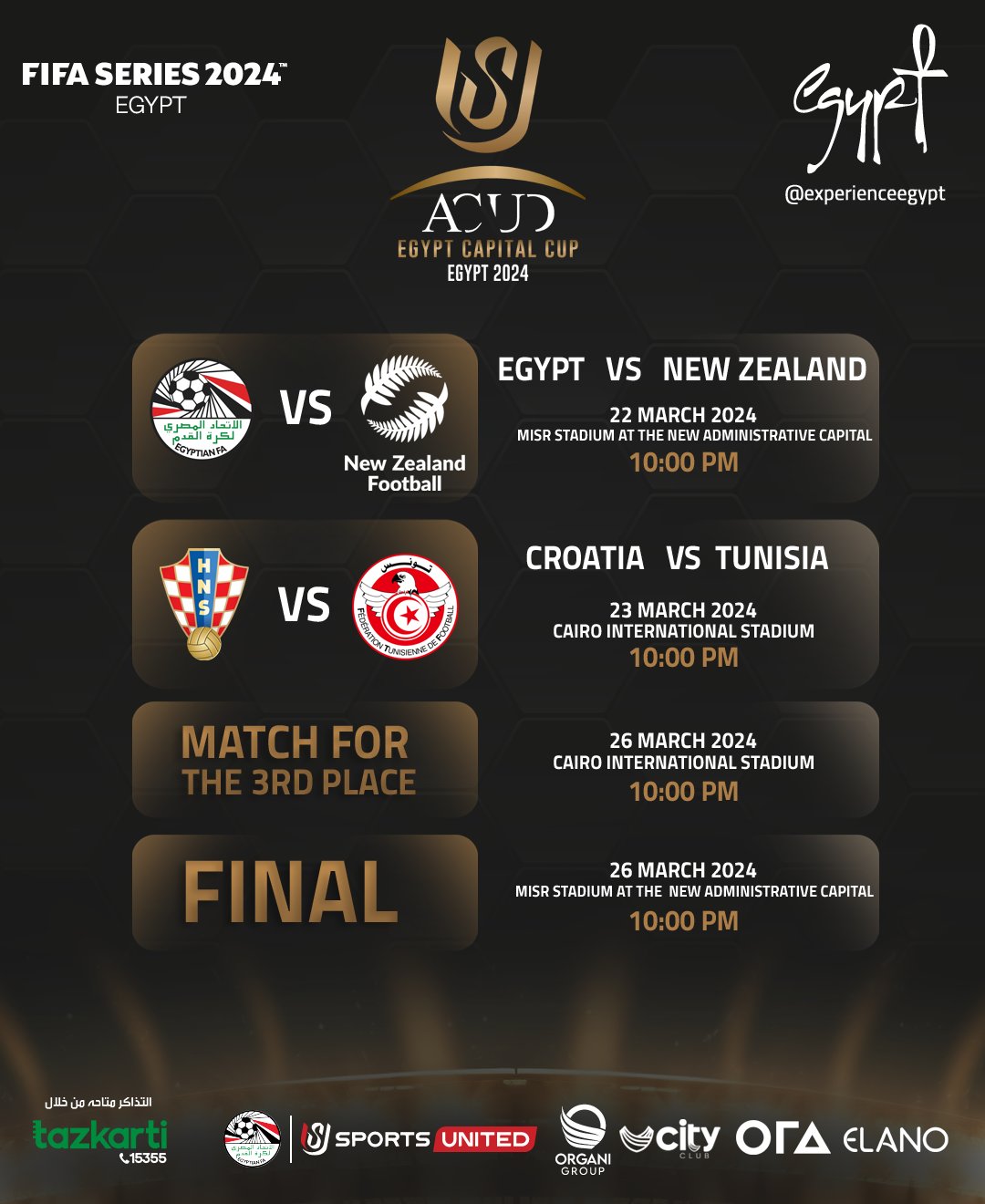 ووفقًا للمواعيد التي تم إعلانها تقام مباراة افتتاح بطولة كأس عاصمة مصر الودية في العاشرة مساء يوم الجمعة المقبل بين منتخبي مصر ونيوزيلندا، وذلك على ملعب ستاد مصر بمدينة مصر الأولمبية بالعاصمة الإدارية الجديدة.