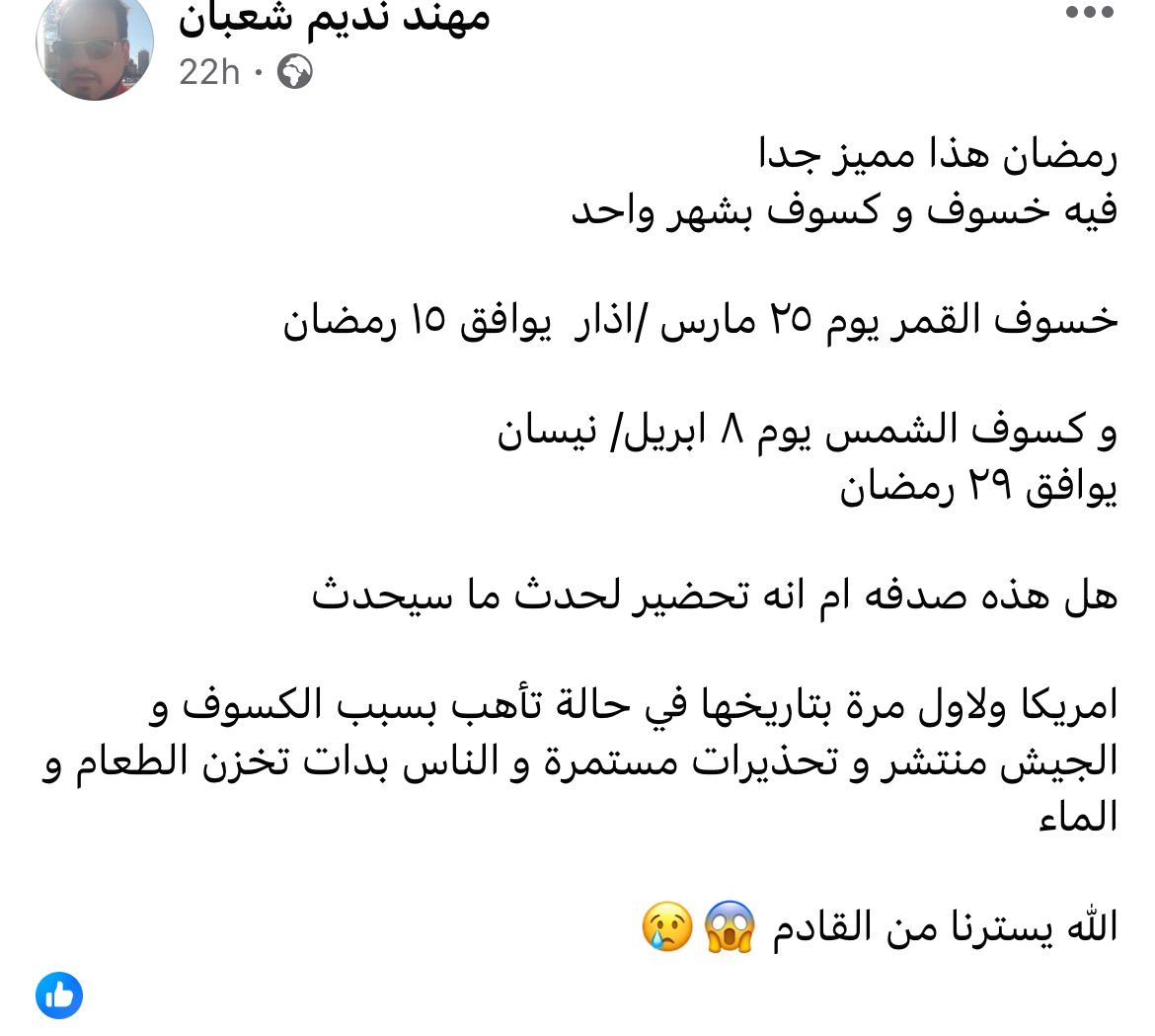 في حالة نادرة من المتوقع أن يشهد شهر رمضان من هذا العام، ظاهرتين فلكيتين مميزتين، حيث من المتوقع أن يشهد كسوف للشمس وخسوف للقمر، وعلى الرغم من أن الكسوف ستشهده أمريكا الشمالية إلى أن هذه الظاهرتان أثارت حالة من الجدل على مواقع التواصل الاجتماعي.