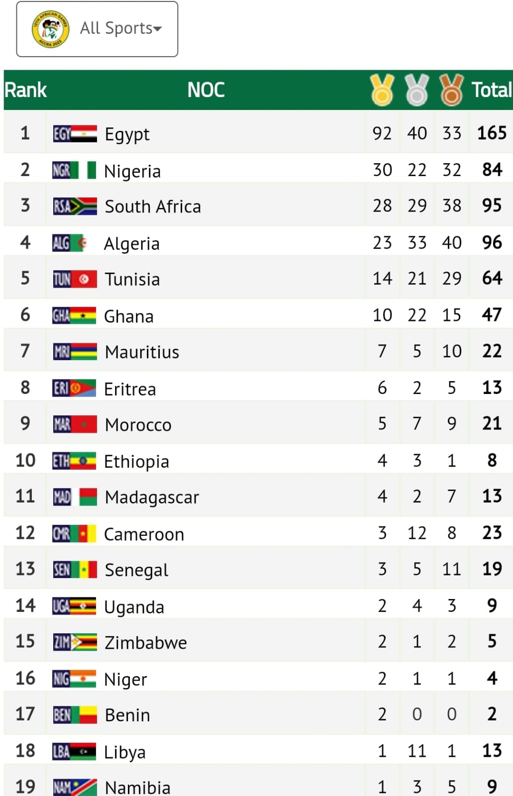ونجح لاعبو بعثة مصر المشاركة في دورة الألعاب الإفريقية في حصد 165 ميدالية متنوعة إلى الأن، وجاءت تفاصيل الميداليات التي حصدتها بعثة الفراعنة كالتالي: 92 ميدالية ذهبية، 40 ميدالية فضية، 33 ميدالية برونزية.
