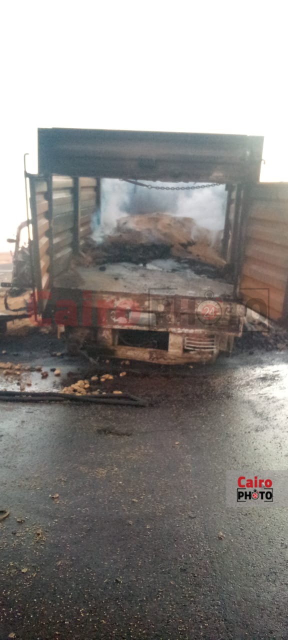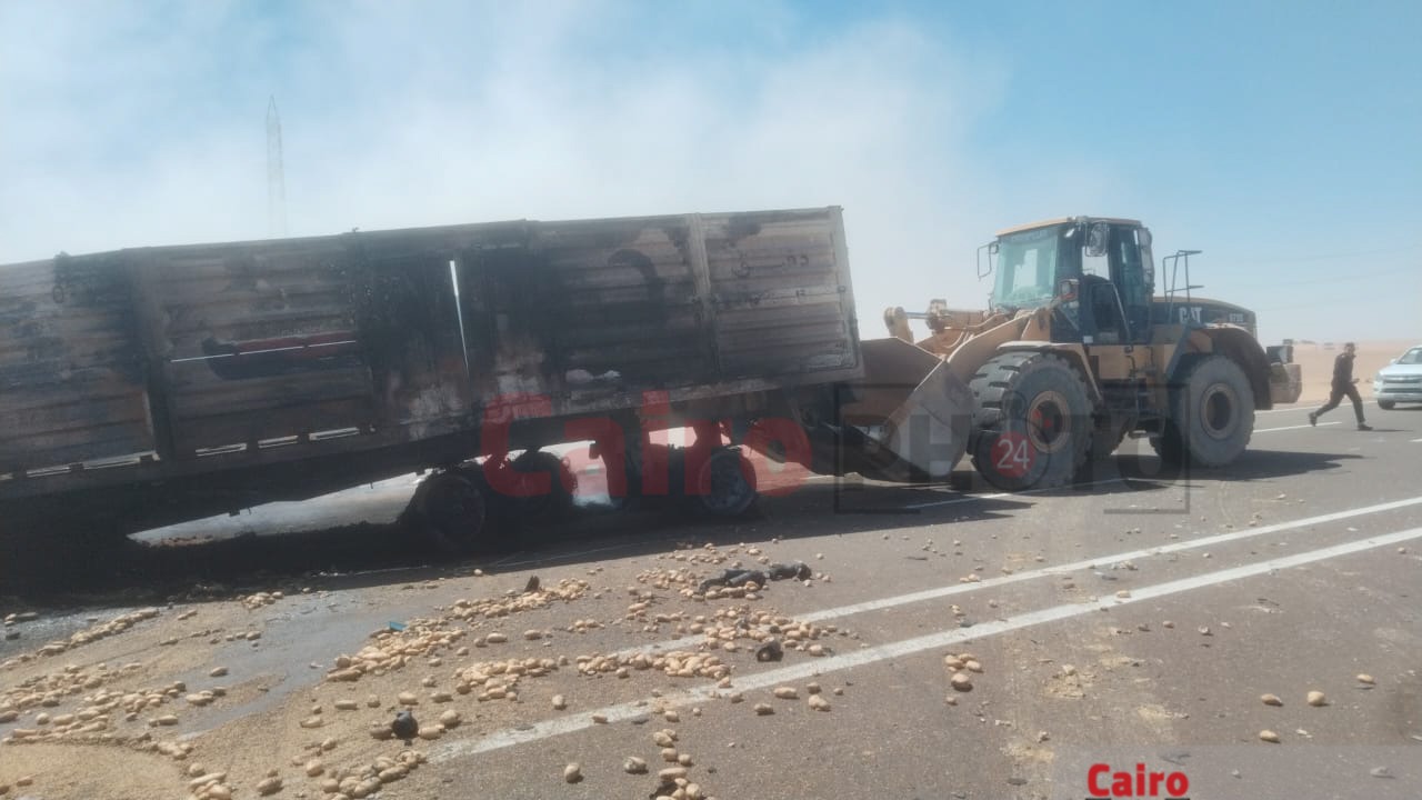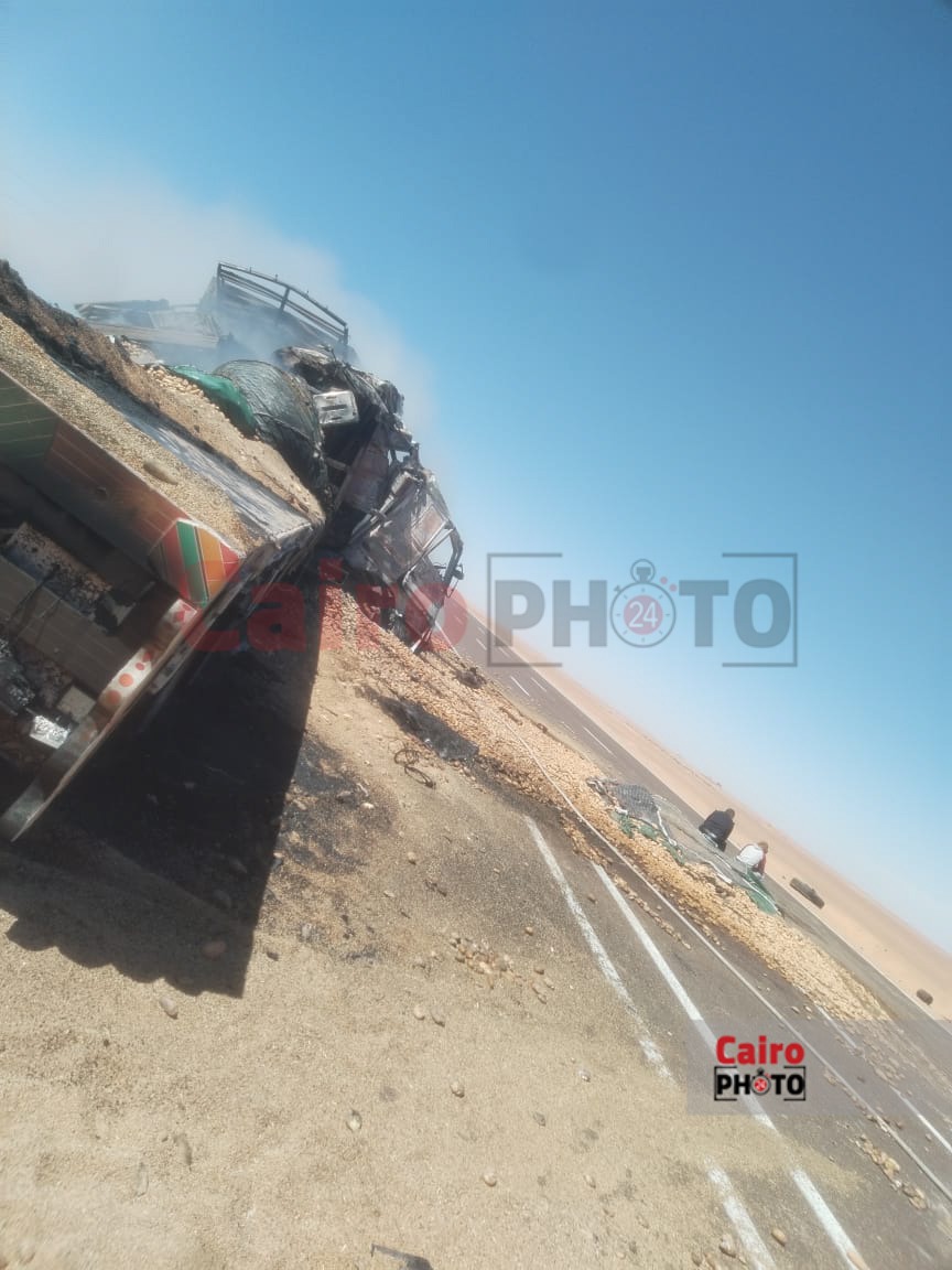 تفحم جثث و140 طن قمح وبطاطس.. تفاصيل حريق تريلات نقل بطريق الوادي الجديد | صور