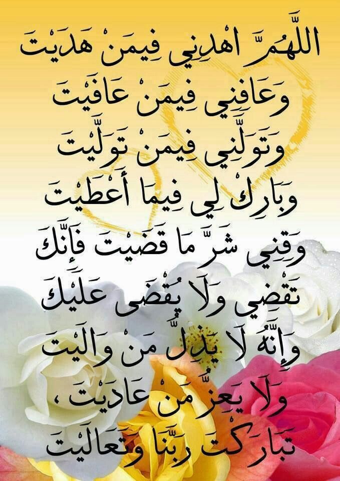 - اللهم أهدني فيمن هديت وعافني فيمن عافيت وتولني فيمن توليت وبارك لي فيما أعطيت وقني شر ما قضيت فإنك تقضي ولا يقضى عليك أنت تمن ولا يمن عليك أنت الغني ونحن الفقراء إليك وأنه لا يذل من واليت تباركت ربنا وتعاليت