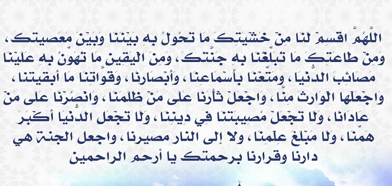 - اللهم أقسم لنا من خشيتك ما تحول به بيننا وبين معصيتك.. ومن طاعتك ما تبلّغنا به جنتَك.. ومن اليقين ما تُهون به علينا مصائبَ الدنيا.. ومتعنا اللهم باسماعِنا وأبصارِنا وقواتنا ما أبقيتنا.. واجعلهُ الوارثَ منا.. واجعل ثأرنا على من ظلمنا.. وانصُرنا على من عادانا.. ولا تجعل مصيبتَنا في ديننا.. ولا تجعل الدنيا أكبرَ همِنا.. ولا مبلغَ علمِنا.. ولا اٍلى النار مصيرنا.. واجعل الجنة هي دارنا.. ولا تُسلط علينا بذنوبنا من لايخافك فينا ولا يرحمنا.
