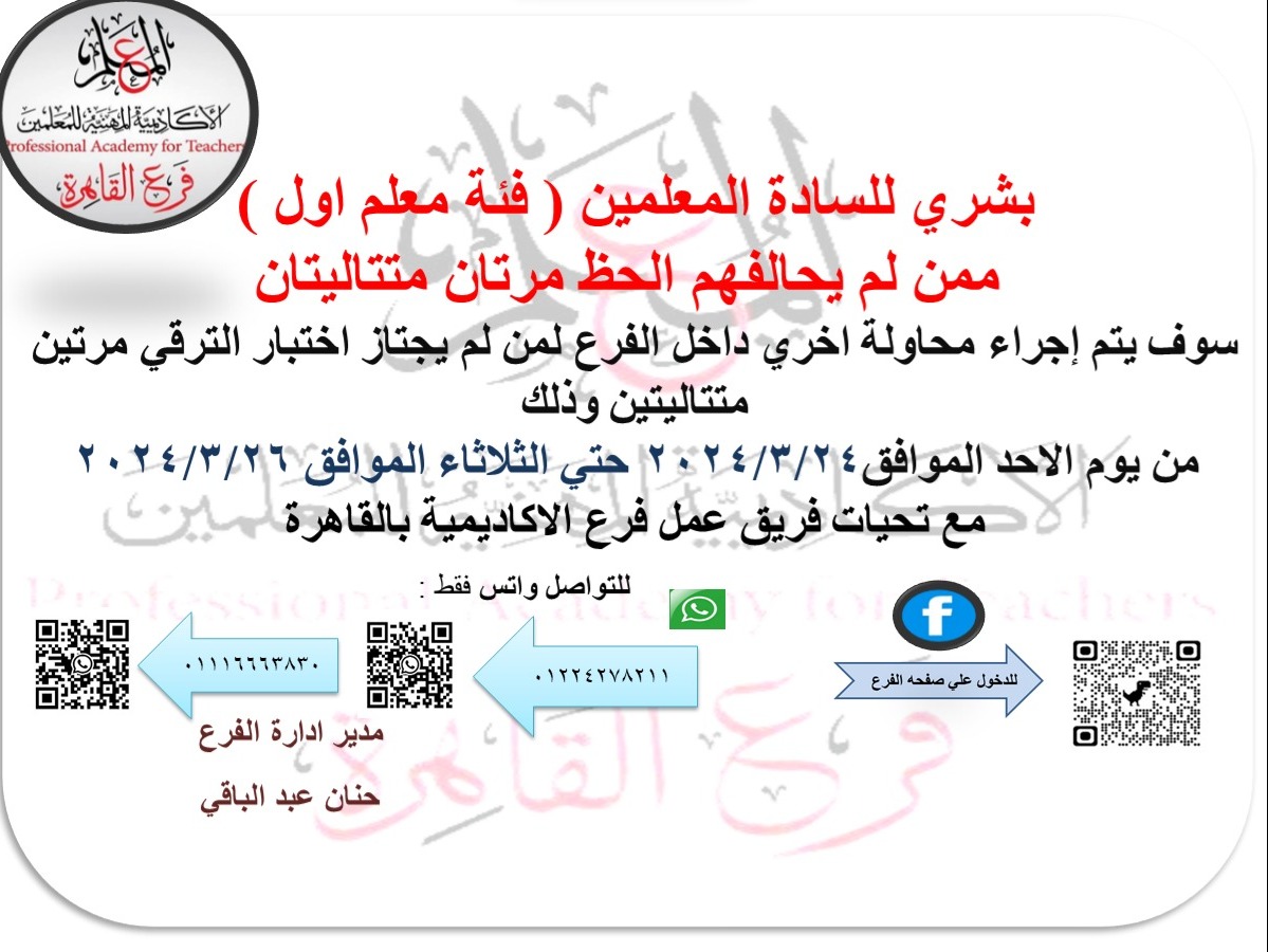 أعلنت الأكاديمية المهنية للمعلمين، أنه سيتم إجراء محاولة أخرى للمعلمين فئة معلم أول الذين لم يحالفهم الحظ في اختبارات الترقي، بداية من الأحد 24 مارس حتى 26 من نفس الشهر.
